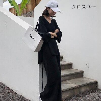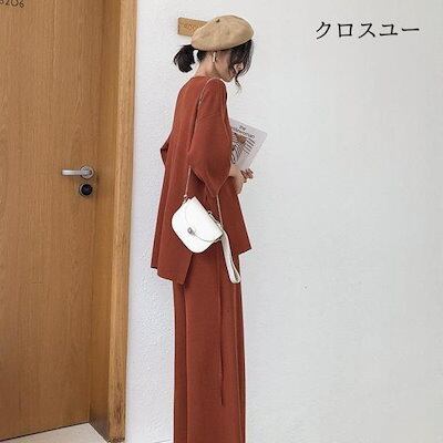 セットアップ ニット レディース 秋と冬 パンツスーツ 上下セット 2点セット トップス セーター スリット ガウチョパンツ ワイドパンツ ロング丈 ゆったり 30代おすすめ商品