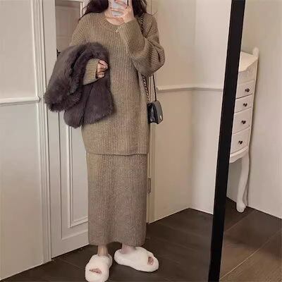 秋冬 セット セーター スカート 上下セット 2点セット 無地 ニットカーディガン スカートロングスカート タイトスカート