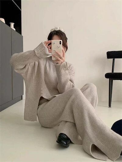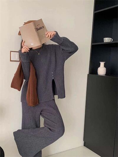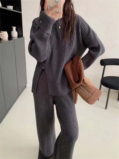 ニット セットアップ レディース パンツ 上品 きれいめ 秋冬 長袖 ニット コーデ セーター ニットアップ クルーネック ワイドパンツ ニットパンツ ケーブルニット スリット ゆったり シンプル 大