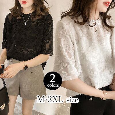 ブラウス レディース シャツ きれいめ 40代 秋夏 半袖 上品 レース 刺繍 ブラウス 白 シャツ ロゴT