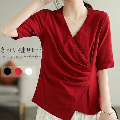 tシャツ 半袖 夏 白 ブラウス vネック シャツブラウス 切り替え 白tシャツ 半袖ブラウス ギャザー 着痩せ ホワイトシャツ 白シャツ ゆったり ギャザーブラウス 無地 レディース トップス 大き