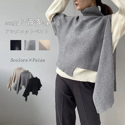 ニットベスト ニット セーター レディース 無地 ベスト ニット ベスト トップス ノースリーブ 半袖 ハイネック タートルネック アシンメトリー 変形 アシメ レイヤード アウター 重ね着 二の腕
