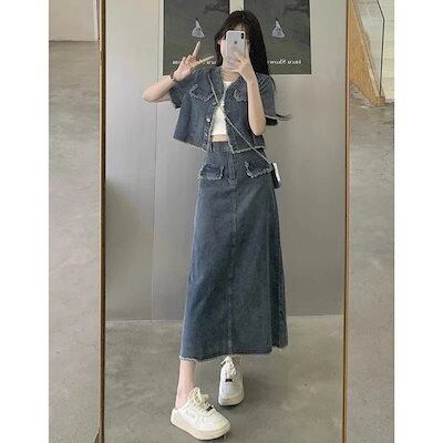 セットアップ 感 レトロ ギャルスーツ 切りっぱなし Vネック デニムジャケット+ロングスカート レディース 半袖トップス/デニムスカート 2点セット