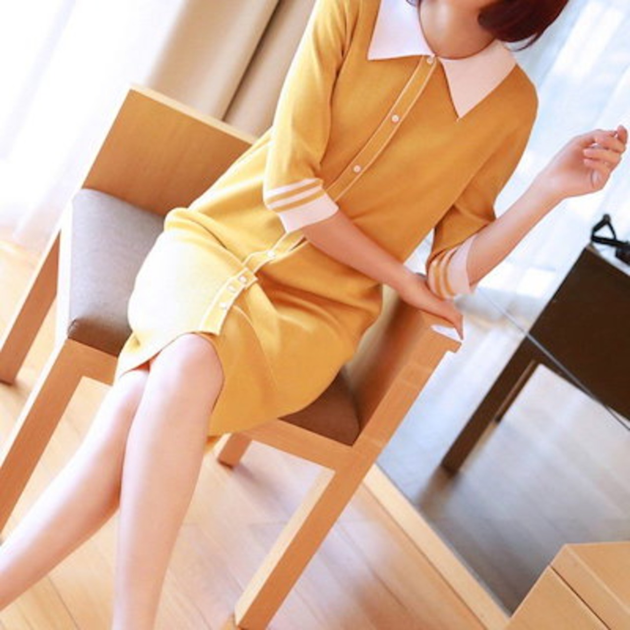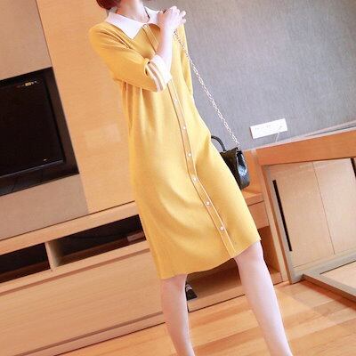 ワンピース ひざ丈ワンピース シャツワンピース Aライン ニット 膝丈 無地 開襟 七分袖 ゆった