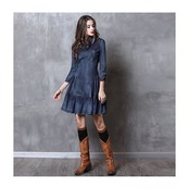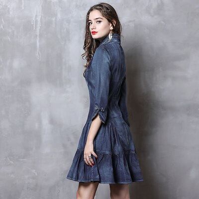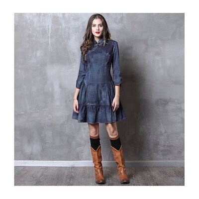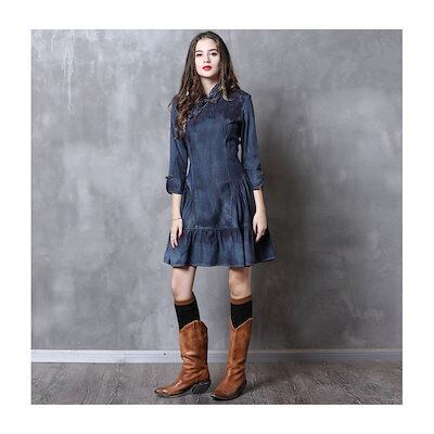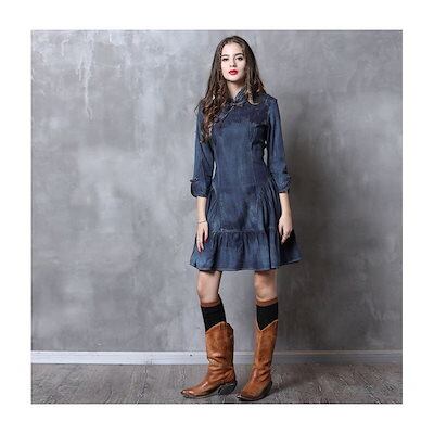 高級な質感デニムワンピース レディース ワンピース デニム 七分袖 チャイナドレス 刺繍 ボリューム フレア aライン アオザイ 膝丈ワンピース リゾート