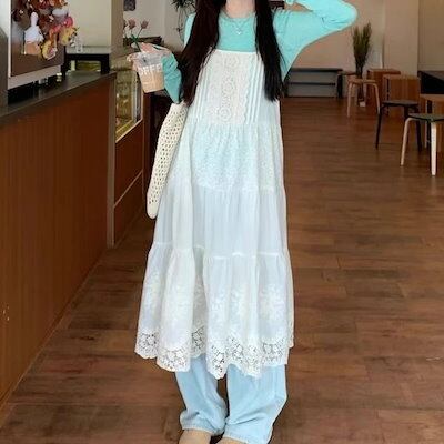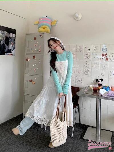 24ワンピース ミディアム丈 ジャンパースカート ジャンスカ ノースリーブ キャミソール Aライン レース 透かし彫り 白 ホワイト 韓国ファッション レディース おしゃれ かわいい ガー