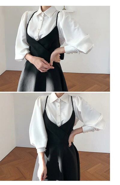 2点セットシャツ+バックリボンキャミワンピースレディースIトップスレオヤード上品黒ワンピースきれいめロングワンピースキャミソールワンピースキャミワンピAラインリボンフレアセットシャツブラウス30