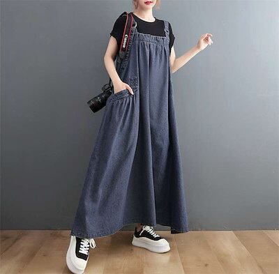 25入荷 新作 サロペット ジャンパースカート ポケット付き オールインワン 50代 キャミワンピース シンプル レディース Aライン デニム ロング 30代 レイヤード ワンピース 無地 大きいサ