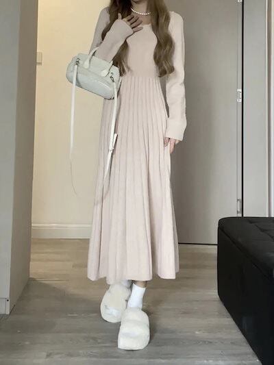 ニットワンピース ワンピース プリーツ Aライン 春秋冬 大人 レディース リブニット フレアスリーブ ロングワンピース カットソー ロングニット タイトワンピース