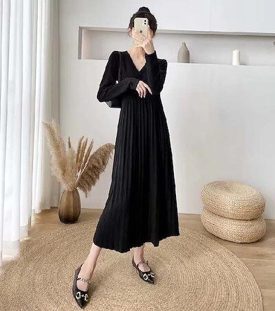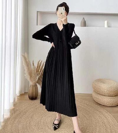 ニットワンピース プリーツワンピース レディース ロング丈 ワンピース ニット ワンピース プリーツ ワンピース ロング丈 長袖 Aライン ゆったり シンプル カジュアル 体型カバー 柔らか 暖か 女