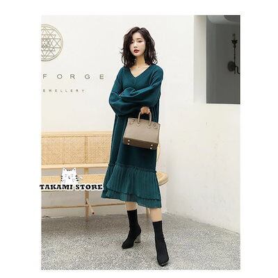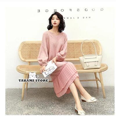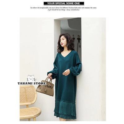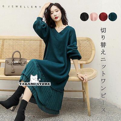 ニットワンピース ニット ワンピース レディース vネック 無地 長袖 厚手 ゆったり 切り替え プリーツ ロング丈 ロングワンピース Aライン