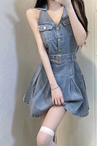 デザインホルターネックデニムワンピース 24新作 Aラインプリーツスカート レディースワンピース