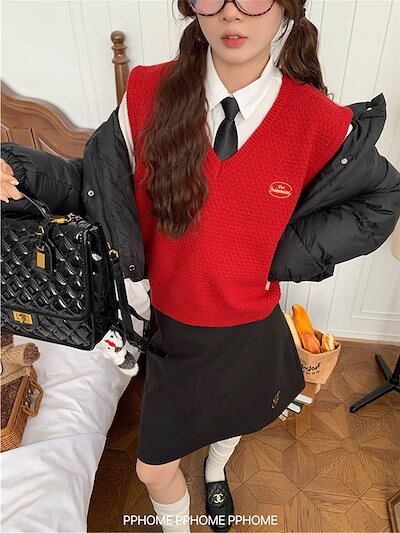 2024秋冬 厚手 柄 Vネック 甘め ニットベスト トップス ミニ丈 ショートセーター レディースファッション系 jk 秋冬 春 学生 高生 フレンチ