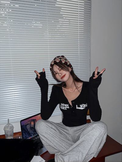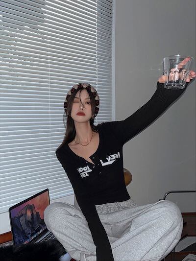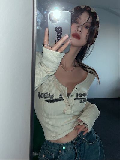2024秋冬トップス ヘンリーネック ショート丈 ロンT スリムフィット tシャツ ロゴプリント 長袖 レトロ 韓国ファッション レディース