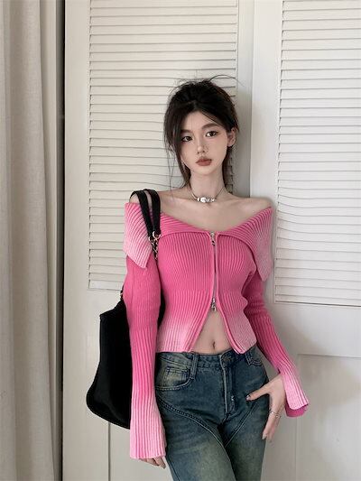 2024秋冬トップス 長袖 ニット 韓国トレンドコーデ セーター おしゃれ 色っぽ 女っぽスタンド丈カジュアルアップ きれいめ大人系ファッションレディース加工アップフェミニン フレンチダブル
