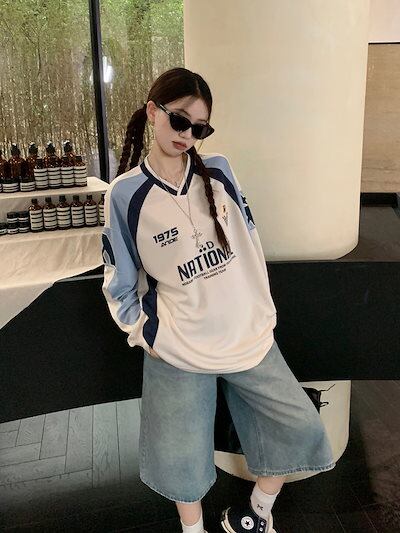 2024 秋冬 トレンド トップスVネックバイカラー長袖 かわいいK-POPTロング黑白レディース韓国風ロゴ衣装ルーズゆったりカジュアルおしゃれサイズスリーブシルエットファッション系サイドシャツフット