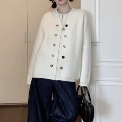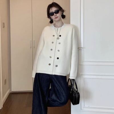 2024秋冬トップス ニット カーディガン ダブルボタン ラウンドネック ジップ チャック 長袖 秋 白 ホワイト おしゃれ かわいい 韓国ファッション レディース お出かけ