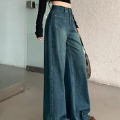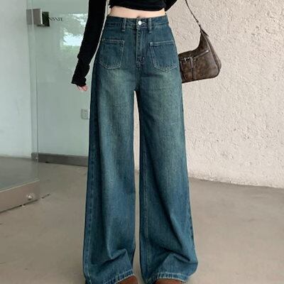 2024秋冬パンツ デニム ジーンズ ロング丈 ワイド ハイウエスト 美脚効果 脚長効果 細見え 秋 ブルー 青 おしゃれ かわいい 韓国ファッション レディース お出かけ