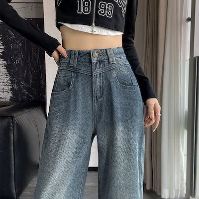 デニムパンツ レトロなハイウエストワイドジーンズレディース秋2024新しいストレート緩いドレープドラッグズボン
