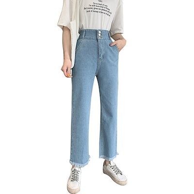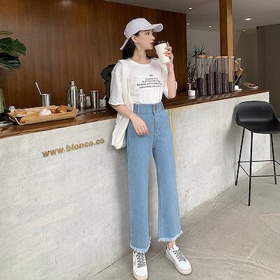 デニムパンツ ハイウエストワイドレッグ大きいサイズジーンズレディース生エッジレッグストレートカジュアルゆったり9分丈パンツ女性