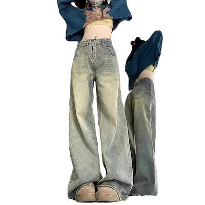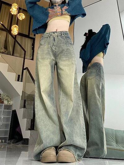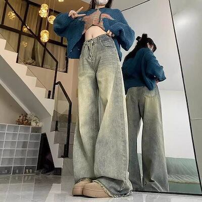 ハイストリートデニムパンツ ハイストリート ワイドパンツ 秋冬新作 ハイウエスト 薄手 ローエッジ デザインセンス ストレート 床丈パンツ 韓国ファッション