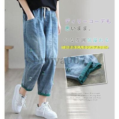 ジーンズ デニムパンツ テーパードパンツ レディース ワイド ボトムス チノパン ロールアップ ウエストゴム 大きいサイズ ゆったり 体型カバー