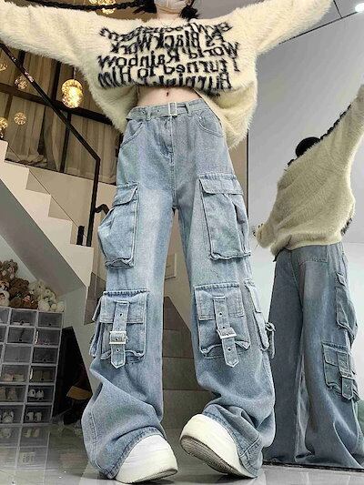 2024秋冬 デニムパンツ ボトムス ハイウエスト ジーンズ K-POP ファッション系韓国風スタイル ゆるダボウェア練習ジーンズ シルエット加工ゆったり レディース カジュアル型 春夏 メンズライク