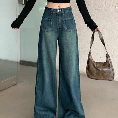 2024秋冬パンツ デニム ジーンズ ロング丈 ワイド ハイウエスト 美脚効果 脚長効果 細見え 秋 ブルー 青 おしゃれ かわいい 韓国ファッション レディース お出かけ
