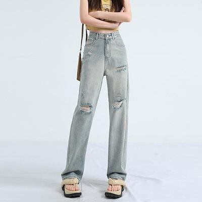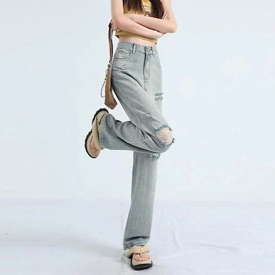 大人気 デニムパンツ 秋 新作 ダメージジーンズ ハイウェスト 着痩せ ワイドパンツ 春夏 スト レート モップパンツ レディース 脚長効果 美脚効果