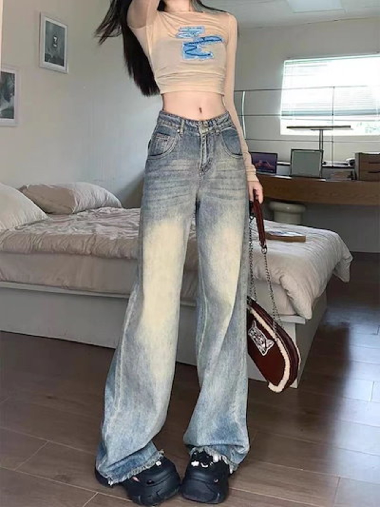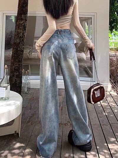 新作 秋 アメリカンレトロデニムパンツレディース秋の新作ハイウエスト着やせギャルデザイン感ワイドストレートモップパンツ デニムパンツ メガ割