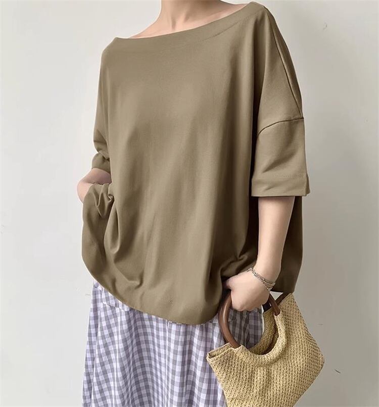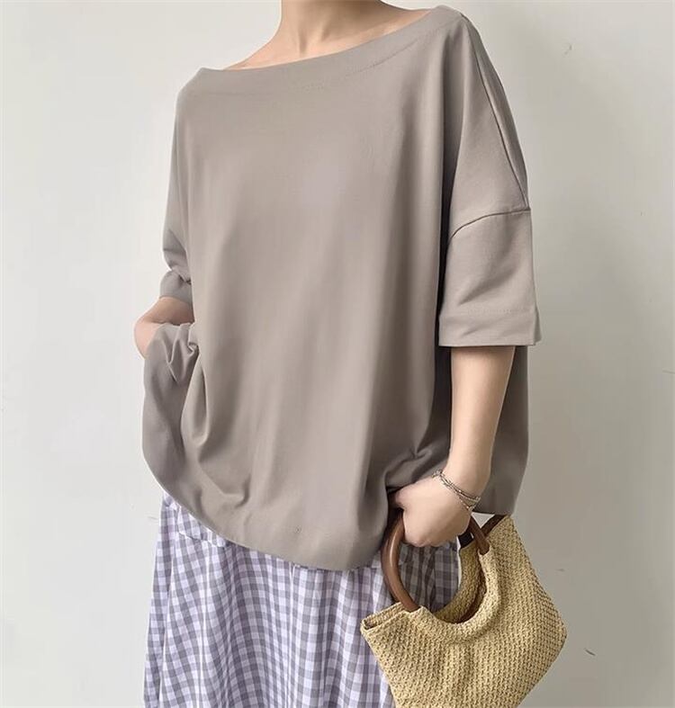 大感謝祭限定トレンド 新品 韓国ファッション ソリッドカラー 五分袖tシャツ 上着 一字襟 綿 トレンド
