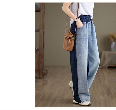 ワイドデニムパンツ 切替 ワイドパンツ レディース スウェット パンツ 春秋 ロングパンツ デニムパンツ ジーンズ ボトムス リラックス ウエストゴム ジーパン バギーパンツ イージーパンツ ゆった