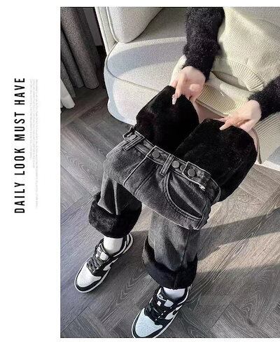 厚手 ワイドパンツ ジーンズレディース ハイウエスト ゆったり 暖かい ストレートロングズボン 裏起毛ズボン 裏起毛パンツ