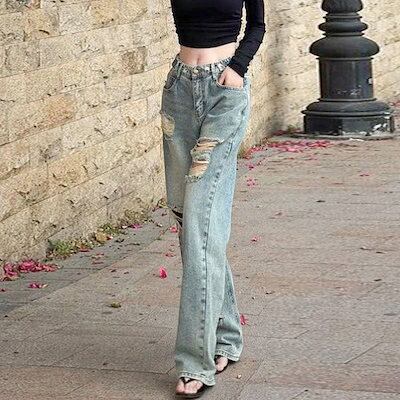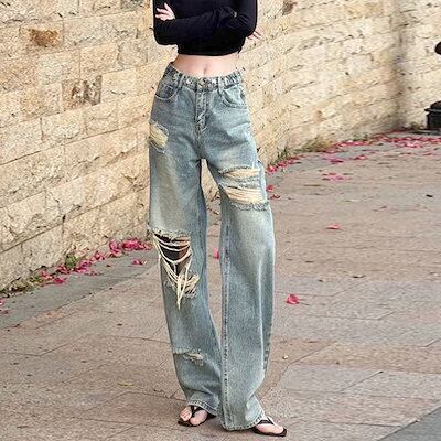 ワイドパンツダメージジーンズ デニムパンツ ストレート モップパンツ ストレート 着痩せ ズボンオールマッチ レディース