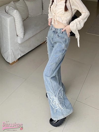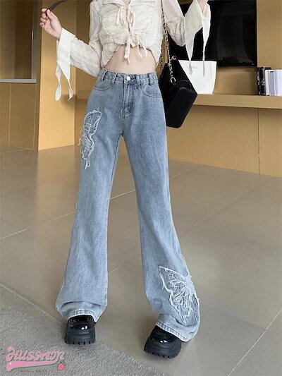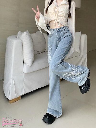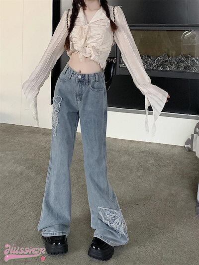 ハイウエスト フリンジ デニムパンツ ボトムス レッグ ゆるダボ ジーンズ ゆったり カジュアル ストリート 切りっぱなしカットオフ 加工 肌見せ ジーパン ファッション 秋 冬 春 スタイルアップ