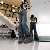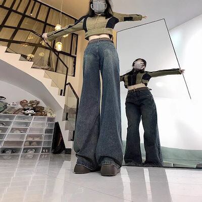 【3日以内出荷】脚長効果!デニムパンツ セメントグレー デザイン パッチワーク ワイドパンツ ハイウエスト ルーズ 床丈パンツ レディース 韓国ファッション