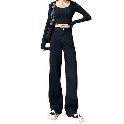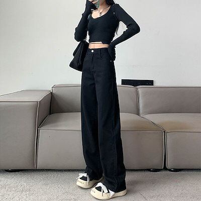 【3日以内出荷】脚長効果!デニムパンツ 2025春秋新作 ブラック ハイウエスト ワイドレッグジーンズ レディース スモール ゆったり ドレープ ドレッグパンツ ストレートレッグ 韓国ファッション