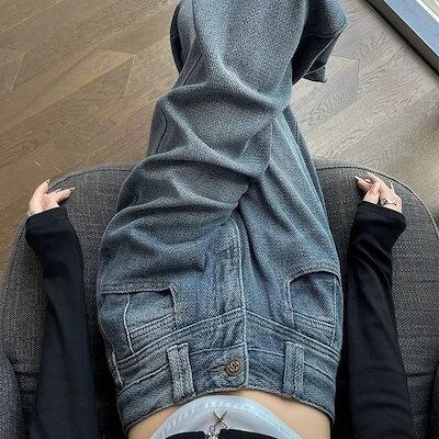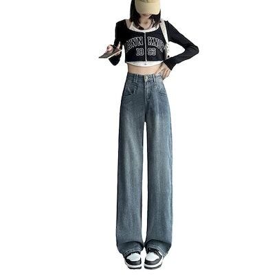 流行のスタイル デニムパンツ レトロなハイウエストワイドジーンズレディース秋2024新しいストレート緩いドレープドラッグズボン