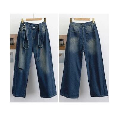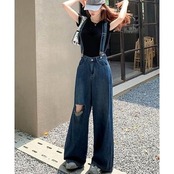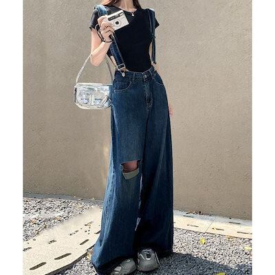 流行のスタイル デニムパンツ レディース ジーンズ サス付デニムワイドパンツ ハイウエスト