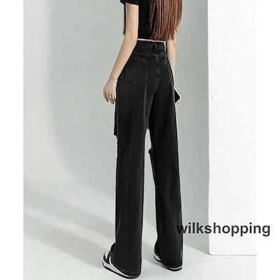 ダメージジーンズ レディース デニムパンツ ダメージ ジーンズ デニム パンツ ボトムス ワイドパンツ ワイドデニム ハイウエスト ダメージパンツ 太もも