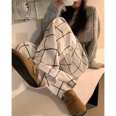 レトロファーファー磨きチェックカジュアルパンツレディース春冬新作厚手ストレートワイドパンツモップパンツ