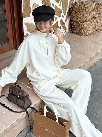 初春新作 上品セットアップ レディース 韓国ファッション 高級感 カジュアルスウェット上下セット 無地シンプル ワイドパンツス+長袖スウェット二点セット 大きいサイズ体型カバー