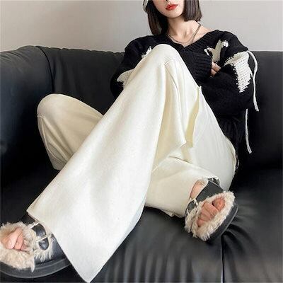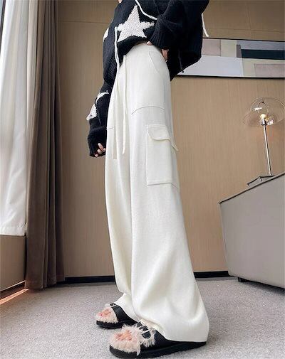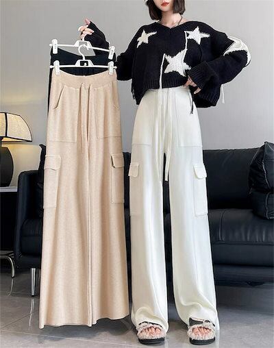 ニットパンツ カーゴパンツ レディース 春 秋 冬 ロングパンツ ワイドパンツ ウエストゴム ストレートパンツ ガウチョ ニット ボトムス ゆるパンツ 無地 シンプル ストレッチ リラックス 個性的