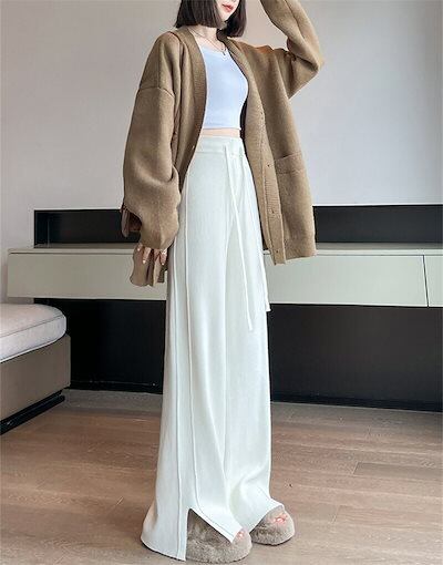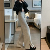 ニットパンツ レディース リブパンツ ワイドパンツ サイドスリット 4色 秋 冬 春リブ ウエストゴム ガウチョパンツ ハイウエスト ストレートパンツ 暖かい プリーツパンツ リブニット パンツ 無地