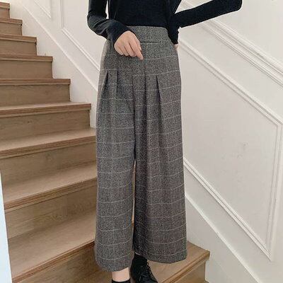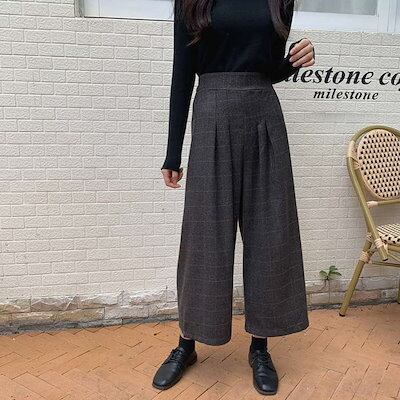 ワイドパンツ レディース 秋冬 チェック柄 無地 ガウチョパンツ タック入り 後ろゴム ハイウエスト フレアパンツ ボトムス パンツ 美脚 おしゃれ カジュアル きれいめ 落ち感 フェミニン 通勤 O