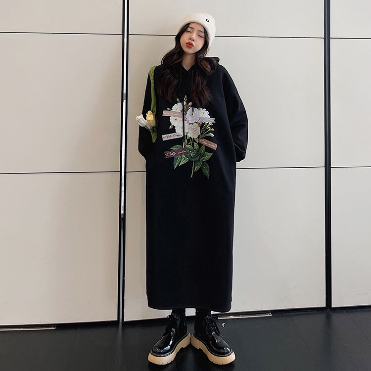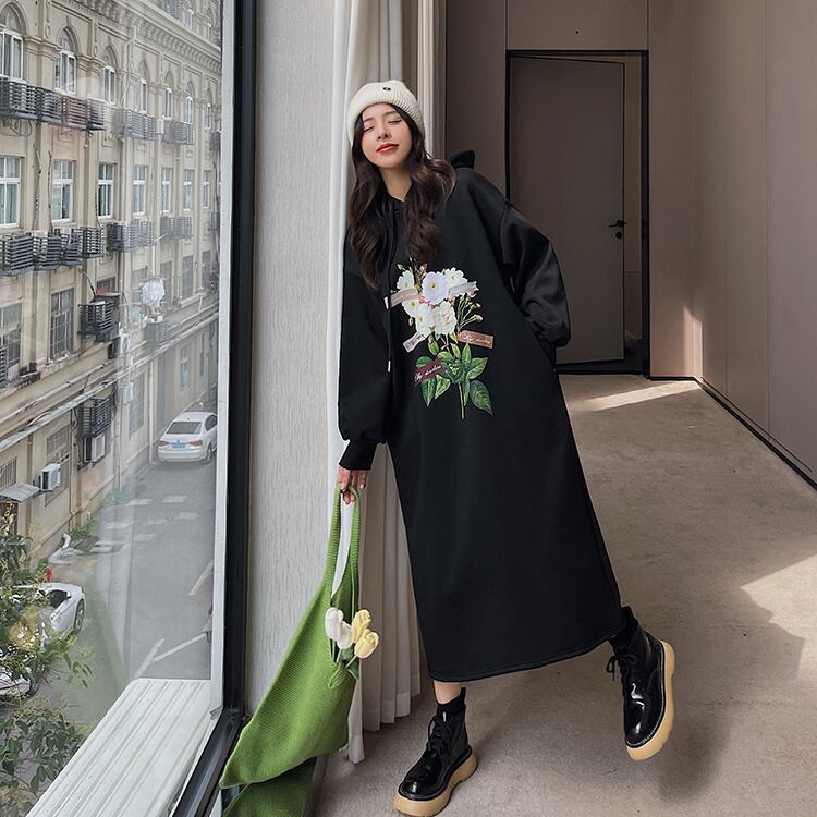 初回送料無料 新作レディースファッション フード付き プリント カジュアルパーカー風ワンピース