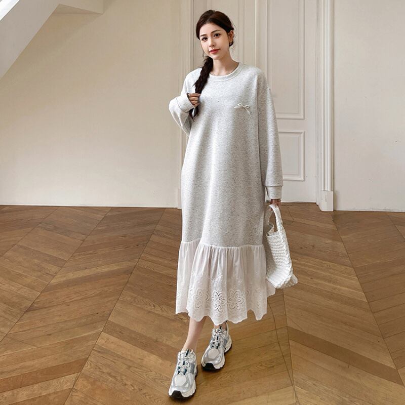初回送料無料 秋冬レディースファッション カジュアル レースパッチワーク パーカー風ワンピース