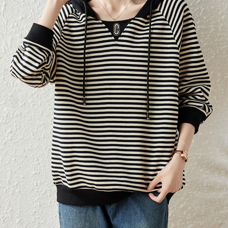初回送料無料 レディースファッション フード付き カジュアル ストライプ パーカー トップス