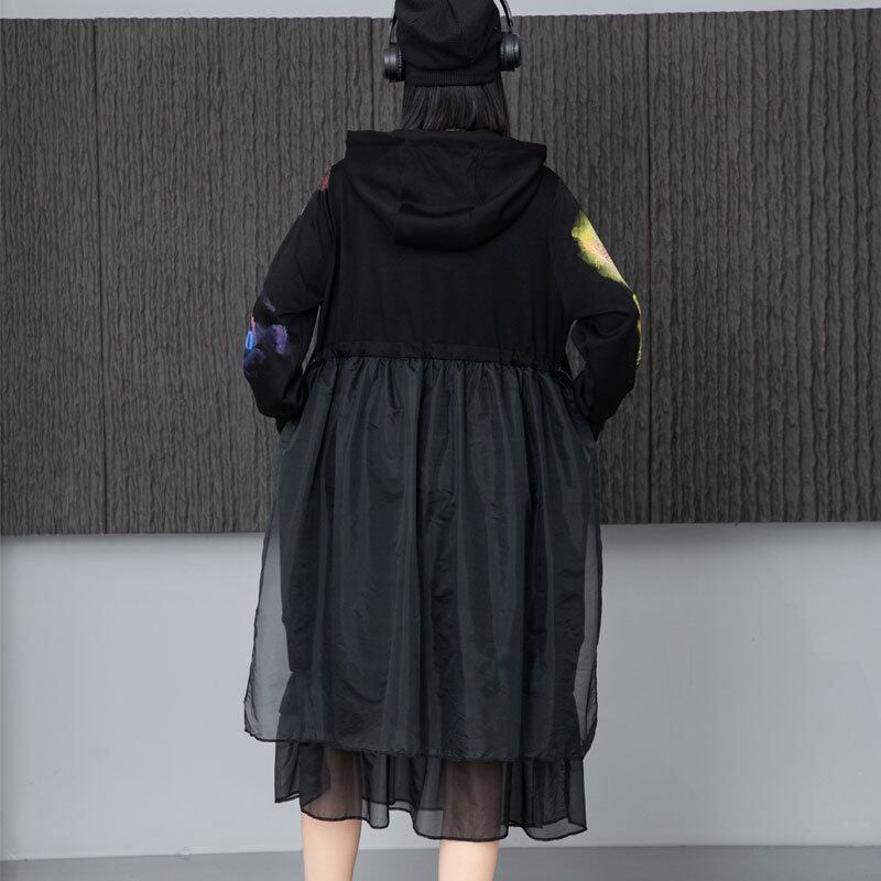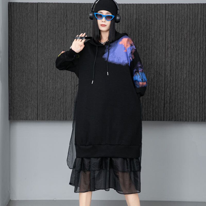 初回送料無料 新作レディースファッション フェイク2枚 パーカー風 フード付き 長袖ワンピース