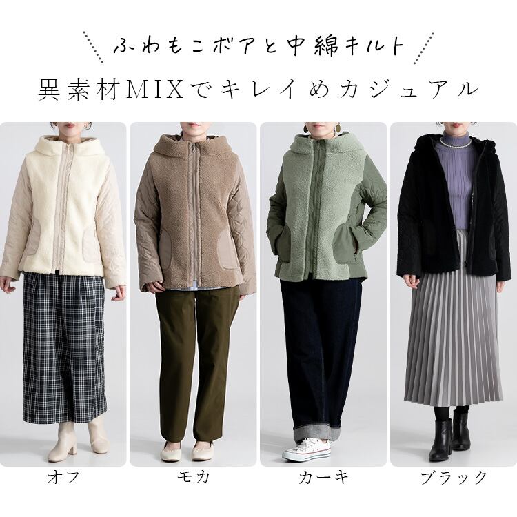 ボア使い中綿フードパーカー フード レディース コート ジャケット 体型カバー ボア 中わた 異素材